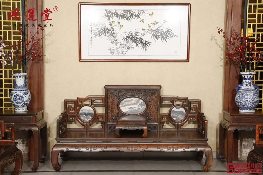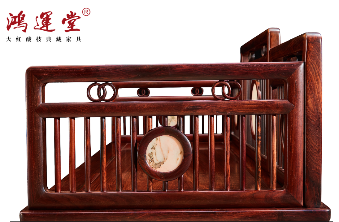 此款沙發(fā)巧妙地將大紅酸枝的溫潤(rùn)與大理石的清涼融為一體,既展現(xiàn)了明式家具的古典精致與華美,又巧妙地注入現(xiàn)代設(shè)計(jì)的簡(jiǎn)約與時(shí)尚。