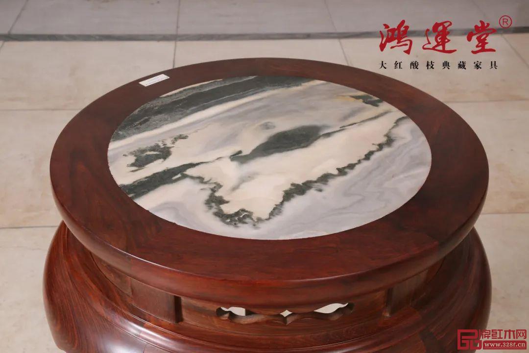 此款圓臺(tái)以大紅酸枝為框架,臺(tái)面鑲嵌天然大理石。大理石紋理千變?nèi)f化,時(shí)而云霧山嶺,時(shí)而山川流水,精彩絕倫。底部銅錢結(jié)構(gòu)造型,寓意著金玉滿堂、財(cái)源廣進(jìn)。