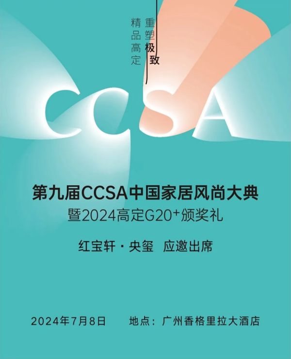 第九屆CCSA中國家居風(fēng)尚大典暨2024高定G20+頒獎禮(簡稱CCSA)將于7月8日在廣州·琶洲·香格里拉酒店舉行,紅寶軒·央璽受邀出席。
