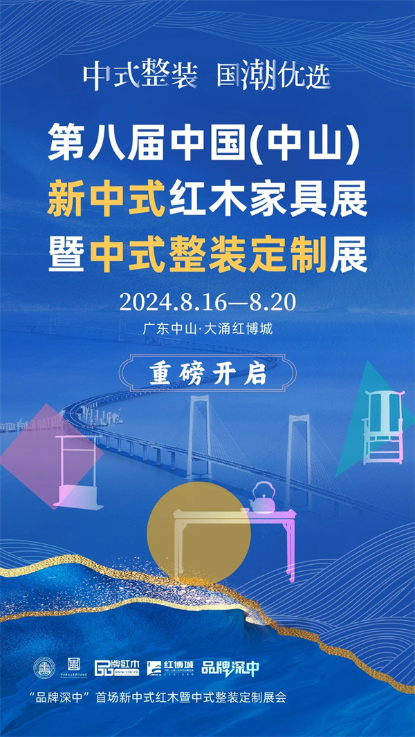 由全聯(lián)民間文物藝術(shù)品商會(huì)藝術(shù)紅木家具專業(yè)委員會(huì)、中國(guó)林產(chǎn)工業(yè)協(xié)會(huì)紅木分會(huì)主辦,弘木傳媒、中國(guó)(大涌)紅木文化博覽城、中山市紅木家具行業(yè)協(xié)會(huì)承辦的第八屆中國(guó)(中山)新中式紅木家具展暨中式整裝定制展,將于8月16日-8月20日在中國(guó)(中山)大涌紅博城盛大啟幕,敬請(qǐng)關(guān)注!