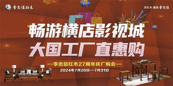 李忠信紅木27周年慶廠購(gòu)會(huì)將于7月20日-31日開展,屆時(shí)會(huì)有多項(xiàng)優(yōu)惠福利回饋消費(fèi)者。