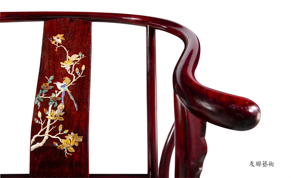 以《紫檀嵌花鳥百寶椅幾》為例,圈椅的靠背板上,以百寶嵌工藝鑲嵌的花鳥圖栩栩如生。