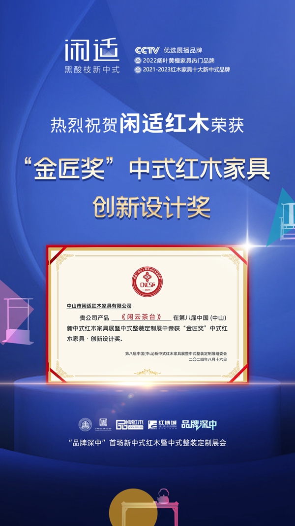 在此背景之下,備受紅木行業(yè)矚目的「2024“金匠獎”中式紅木家具精品」評選結果也在本次展會開幕式重磅揭曉,引發(fā)了廣泛關注。閑適紅木憑借其卓越的設計實力與精湛的工藝水平,攜原創(chuàng)設計新品——闊葉黃檀《閑云茶臺》榮耀參選,并憑借其獨特的設計理念、精湛的雕刻技藝以及對傳統(tǒng)文化的深刻詮釋,在眾多參評作品中脫穎而出,一舉摘得「2024“金匠獎”中式紅木家具 創(chuàng)新設計獎」。這一榮譽的獲得,不僅是對閑適紅木創(chuàng)新設計與精湛工藝的肯定,更是其實至名歸、實力與榮譽并存的完美體現(xiàn)。