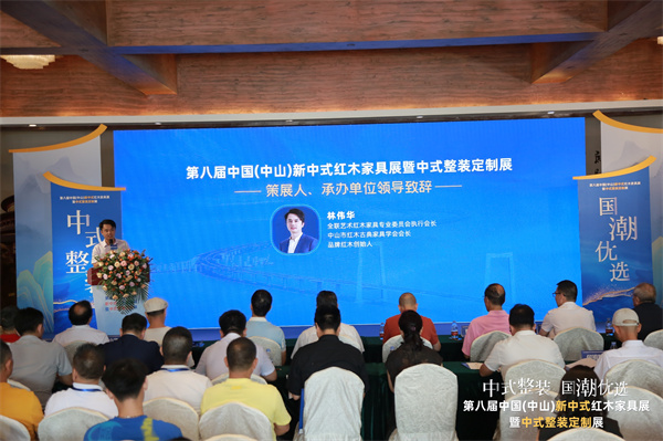 全聯(lián)藝術(shù)紅木家具專業(yè)委員會執(zhí)行會長、中山市紅木古典家具學(xué)會會長、品牌紅木創(chuàng)始人林偉華致辭