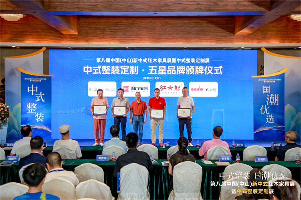中國林產(chǎn)工業(yè)協(xié)會紅木分會會長吳勁松(左三)為中式整裝定制·五星品牌頒牌