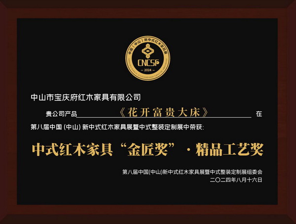 第八屆新中式紅木家具展暨中式整裝定制展現(xiàn)場(chǎng)盛況近期,第八屆中國(中山)新中式紅木家具展暨中式整裝定制展于中國(大涌)紅木家具文化博覽城圓滿舉辦。中山市寶慶府紅木有限公司(以下簡(jiǎn)稱寶慶府紅木)攜其匠心獨(dú)運(yùn)的緬甸花梨精品《花開富貴大床》首次亮相展會(huì),大放異彩,斬獲2024“金匠獎(jiǎng)”中式紅木家具·精品工藝獎(jiǎng)。品牌負(fù)責(zé)人龐曉翔受邀出席開幕式,與一眾領(lǐng)導(dǎo)嘉賓共享中山紅木產(chǎn)業(yè)盛會(huì)。