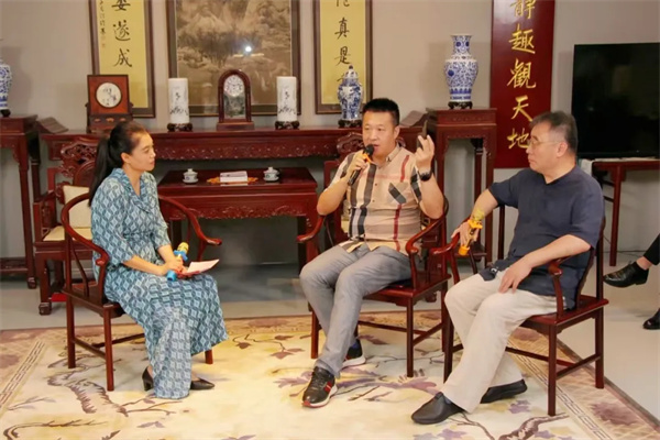 中國古陶瓷學會會員、山東省博物館學會陶瓷專業(yè)委員會專家委員、綠寶石藝術(shù)陶瓷館館長朱東明(右一)與鼎石(山東)地產(chǎn)董事長、鳳熙書院總裁高山(右二)展開精彩的對話