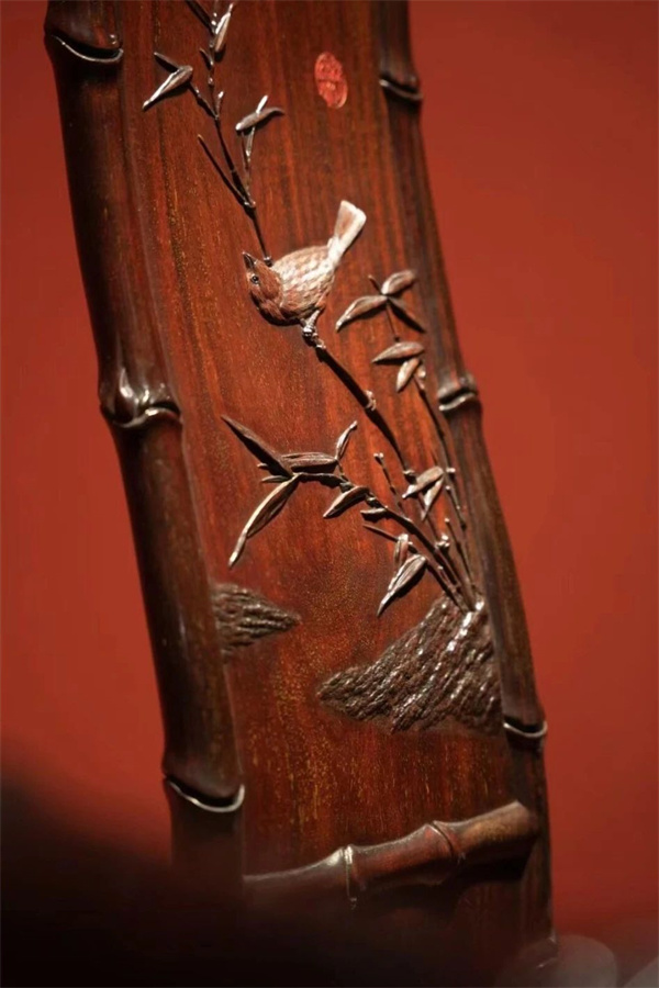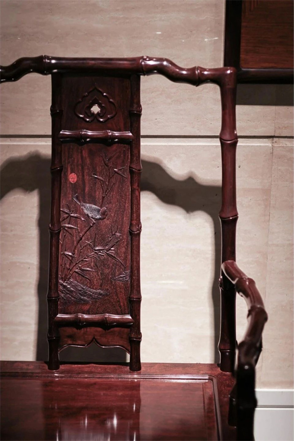 竹節(jié)椅可分為三段式攢靠背,上截雕卷葉紋,葉瓣邊緣肥嫩,楚楚動(dòng)人;中截竹節(jié)邊框裝雕花絳環(huán)板,寒雀與翠竹相望,詩(shī)意盎然;下截被設(shè)計(jì)為壺門亮腳,而不采用云紋,其意當(dāng)為烘托中段絲翎檀雕花板,以免畫蛇添足。
