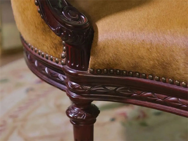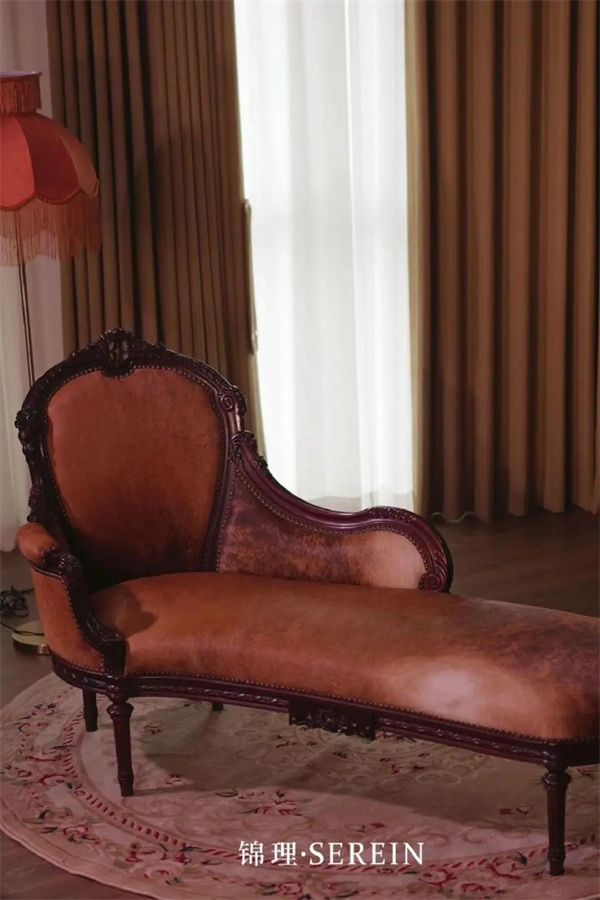 一面是中式紅木的精雕細(xì)琢,另一面則是法式洛可可風(fēng)格的浪漫圖案,螺狀紋飾與波浪曲線(xiàn)交織,營(yíng)造出一種無(wú)與倫比的視覺(jué)盛宴。而榻上覆蓋的稀有馬皮,更是為這份奢華增添了一抹自然與舒適的觸感,讓人在休憩之余,也能感受到老派貴族的典雅與風(fēng)范。