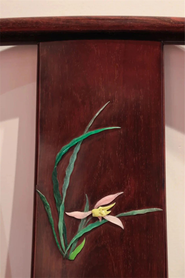 椅身所雕琢的蘭花,形態(tài)各異,栩栩如生,每一片葉子的陰陽(yáng)向背、轉(zhuǎn)合俯仰都經(jīng)過(guò)精心繪制,展現(xiàn)出蘭花獨(dú)有的清雅與高潔。