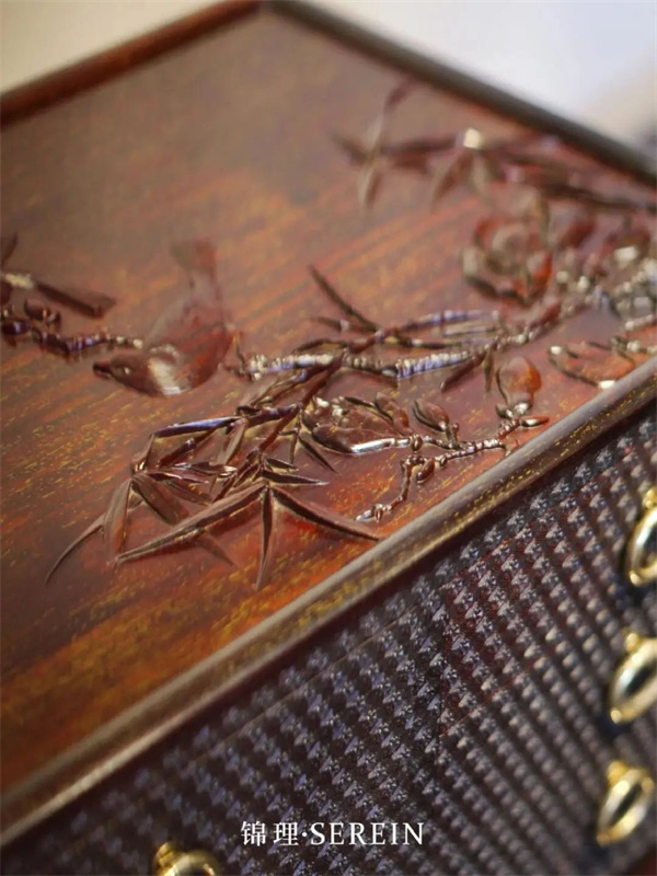 這款?yuàn)y匣采用名貴的小葉紫檀,上方雕刻黃君璧的《玉蘭雙棲圖》。工筆花鳥(niǎo)繼承了宋代院體工筆畫(huà)的傳統(tǒng),具有清高古雅的格調(diào)。