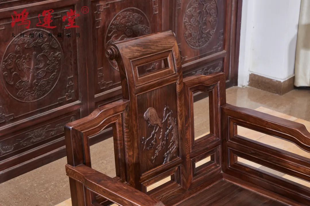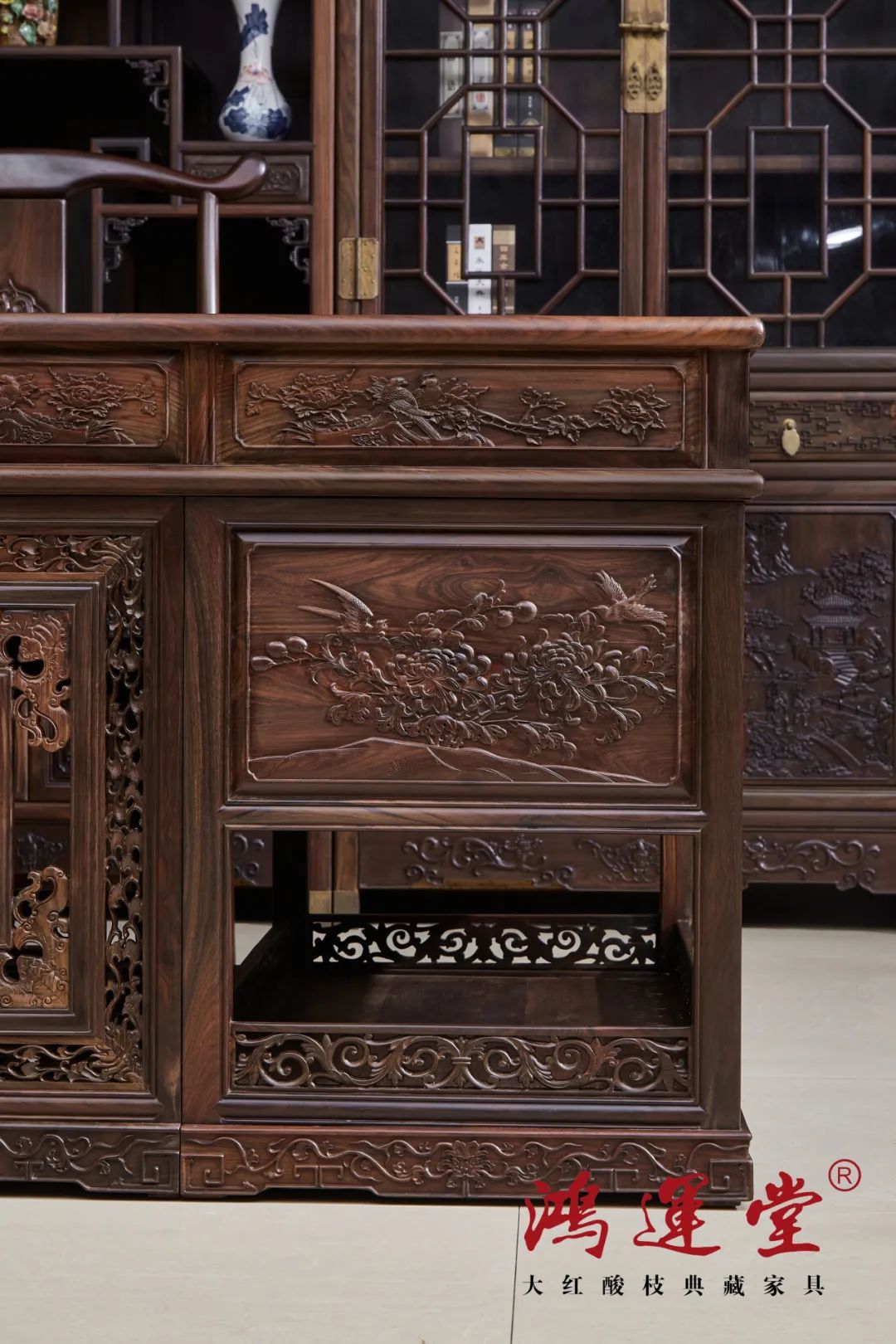此款書桌搭配傳統官帽椅,器型經典、選材考究,大紅酸枝木色澤明雅,質地極佳。圍側面板均花鳥圖,寓意呈祥。