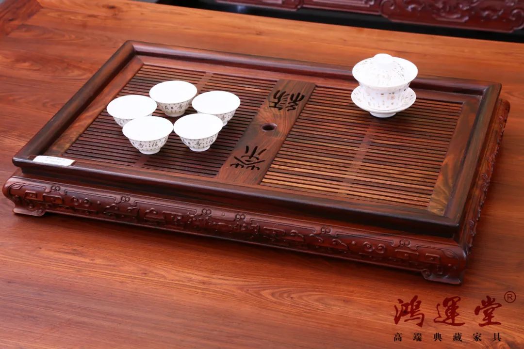 此款茶臺器型經典,桌面分段式攢框嵌板,且嵌有銅茶盤,大紅酸枝面板木紋瑰麗。