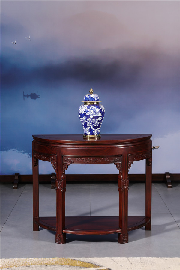 除了傳統(tǒng)的圓桌外,鼎順紅木還有半月桌。半月桌以其獨特的半圓形設計,為家具空間增添了一抹別樣的風情。它既可單獨使用,也可作為組合家具的一部分,與其他家具相互呼應,共同營造出一種和諧而富有變化的空間氛圍。紅酸枝的材質(zhì)使得半月桌在視覺上更加溫潤而富有質(zhì)感,成為了一件集實用與美觀于一身的藝術品。