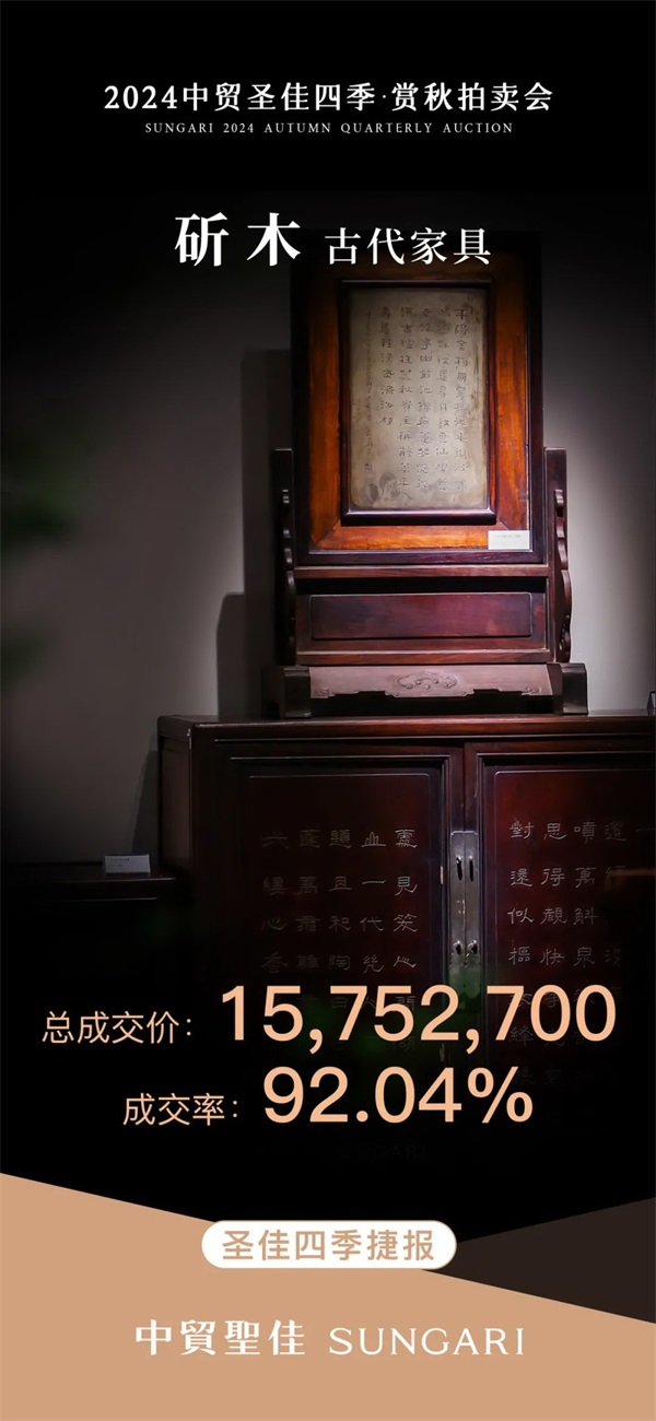 [摘要]2024年中貿(mào)圣佳四季·賞秋拍賣會,斫木-古代家具專場以成交額1575.27萬元、成交率92.04%圓滿收槌。