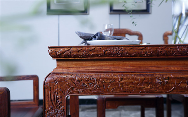 餐桌的細(xì)節(jié)之處,巧妙融入了蓮花浮雕紋飾,蓮花作為中國傳統(tǒng)文化中的高潔象征,寓意著使用者品德高尚、心境純凈。