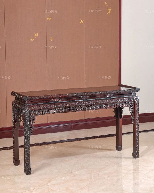 “鼓腿澎牙”上肩部也略有不同。平腿下端向里彎曲,彎段較短。對(duì)于炕幾、茶幾等輕型矮寬家具,總體近似屈腿縱體的奔馬,宜用鼓腿與之協(xié)調(diào)。