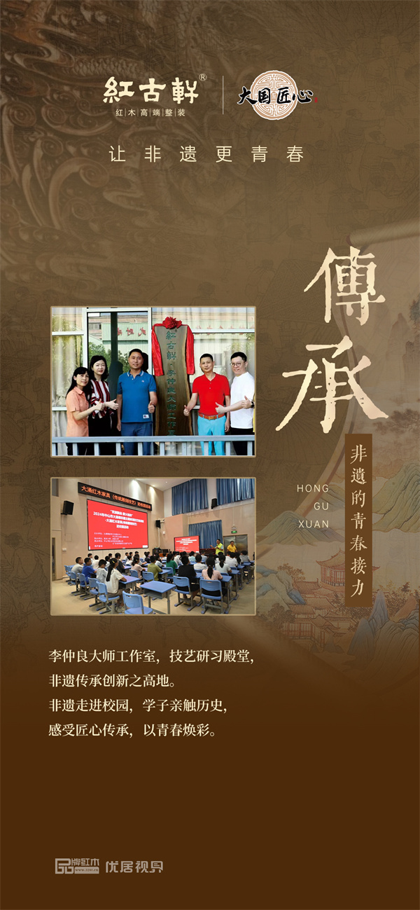 傳世工程,作為文化復興戰(zhàn)略的重要組成部分,肩負著激活并傳承千年匠心精神的崇高使命。作為廣東省省級非物質(zhì)文化遺產(chǎn)·大涌紅木家具傳統(tǒng)雕刻技藝傳承基地和廣東省非物質(zhì)文化遺產(chǎn)生態(tài)性保護示范基地,紅古軒將繼續(xù)將技藝的保護與傳承視為己任,助力傳世工程。