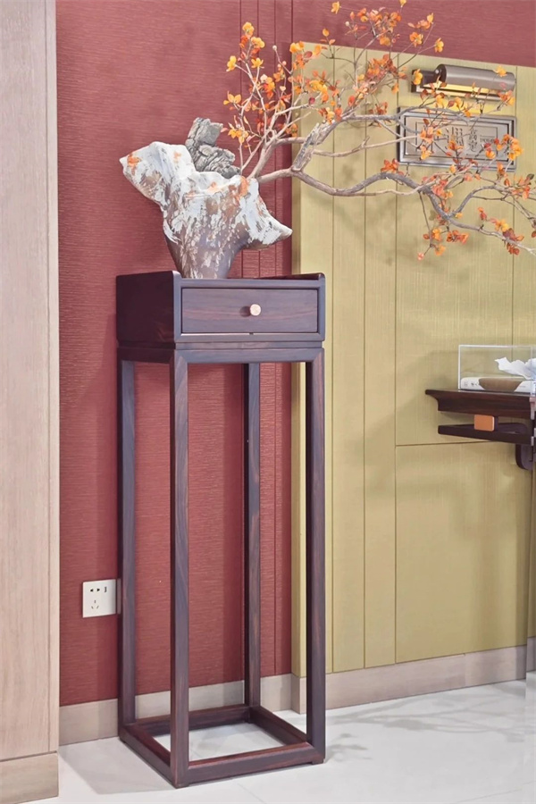 轉(zhuǎn)身步入客廳,一眼就被那個(gè)設(shè)計(jì)感十足的花架所吸引。深色木質(zhì)質(zhì)感滿滿,仿佛一場(chǎng)視覺盛宴正在上演。