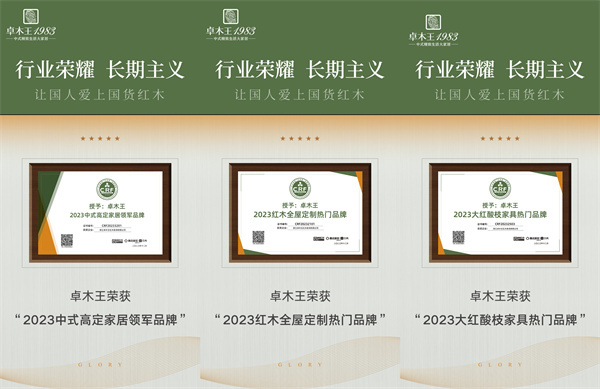 從政府到行業(yè),卓木王榮獲了諸如北京人民大會(huì)堂特選定制品牌、中國(guó)輕工業(yè)百?gòu)?qiáng)企業(yè)、“浙江制造”紅木家具團(tuán)體標(biāo)準(zhǔn)起草單位、東陽(yáng)市木雕紅木家具龍頭企業(yè)等眾多殊榮,累計(jì)獲得60多項(xiàng)國(guó)家級(jí)榮譽(yù)及數(shù)百項(xiàng)行業(yè)榮譽(yù)。