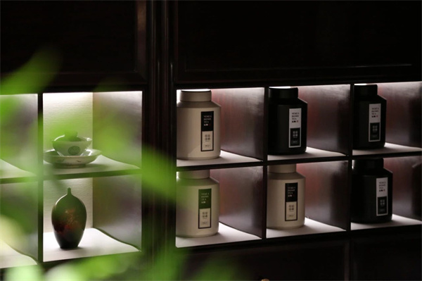 右后方墻面,柜子嵌入,各式茶用品整齊排列,長方格字,秩序井然,仿佛時(shí)間的守護(hù)者,靜靜訴說著茶文化的深厚底蘊(yùn)。