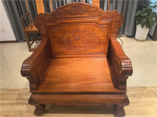 沙發(fā)取名福澤天下,寓意把幸?;菁疤煜滤腥?。背板分三段攢裝,背板中間如意形開光,兩側(cè)滿月形開光,亭臺(tái)樓閣的雕刻題材,雕刻技法復(fù)刻了中國(guó)山水畫的畫法,遠(yuǎn)山近水,近景精雕細(xì)刻,遠(yuǎn)景創(chuàng)造意境。