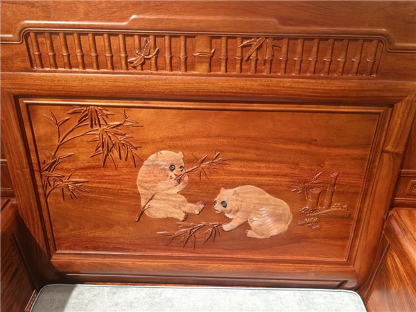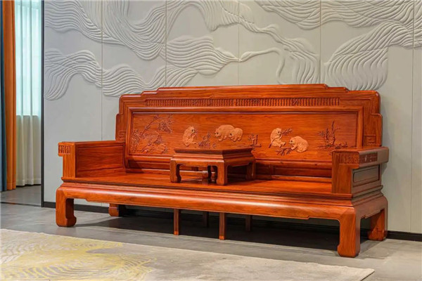 國(guó)寶沙發(fā)的背板,堪稱工藝與美學(xué)的完美融合,其雕刻之精細(xì)、意境之深遠(yuǎn),令人嘆為觀止。背板之上,采用了古老而精湛的絲翎檀雕技藝,將一幅生動(dòng)活潑、栩栩如生的熊貓嬉戲圖定格于方寸之間。