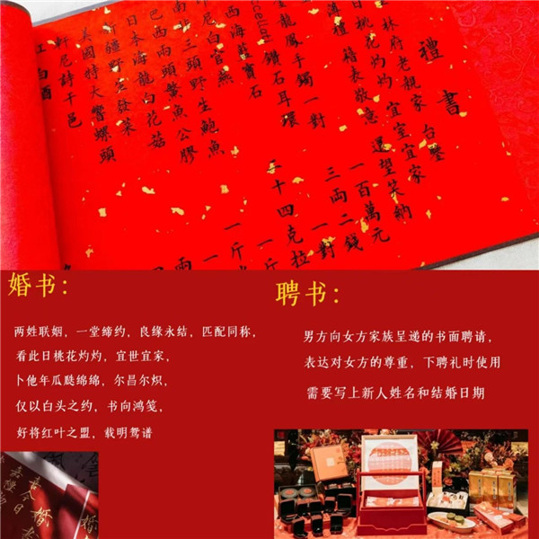 今天就帶大家看看傳統(tǒng)中式婚禮,三書六禮、四聘五金、八抬大轎、十里紅妝……一一說過去太過累贅,咱今天只簡單說說。