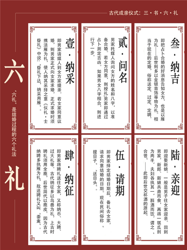 六禮:在中國傳統(tǒng)的婚姻習(xí)俗中,從議婚至完婚過程中的六種禮節(jié),分別是納采,問名,納吉,納征,請期,親迎。