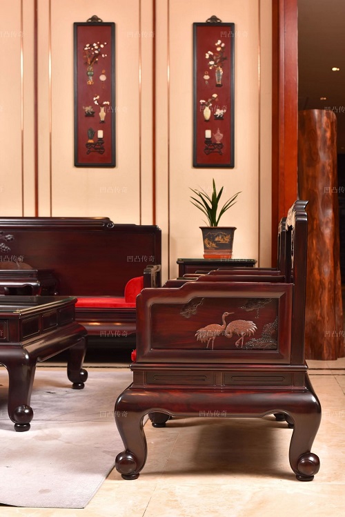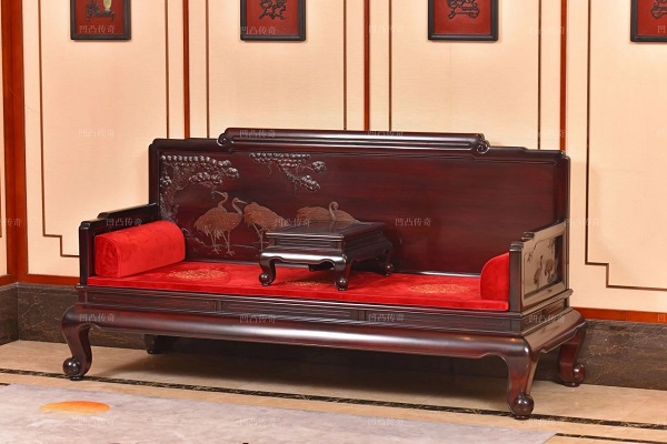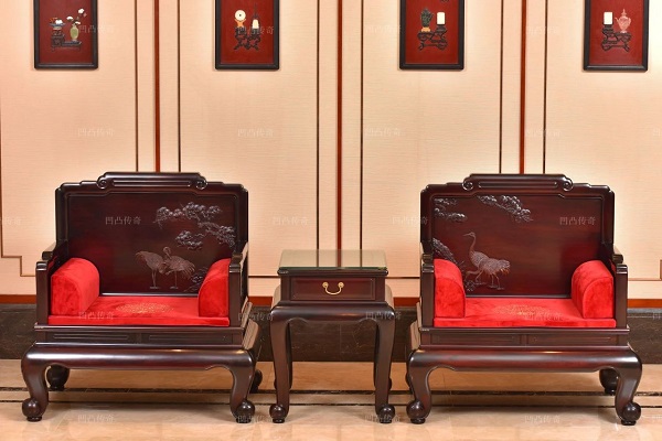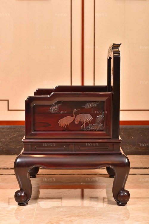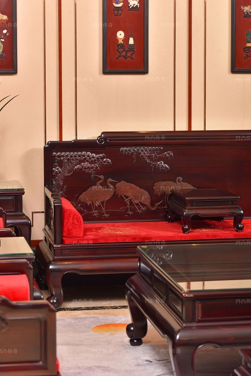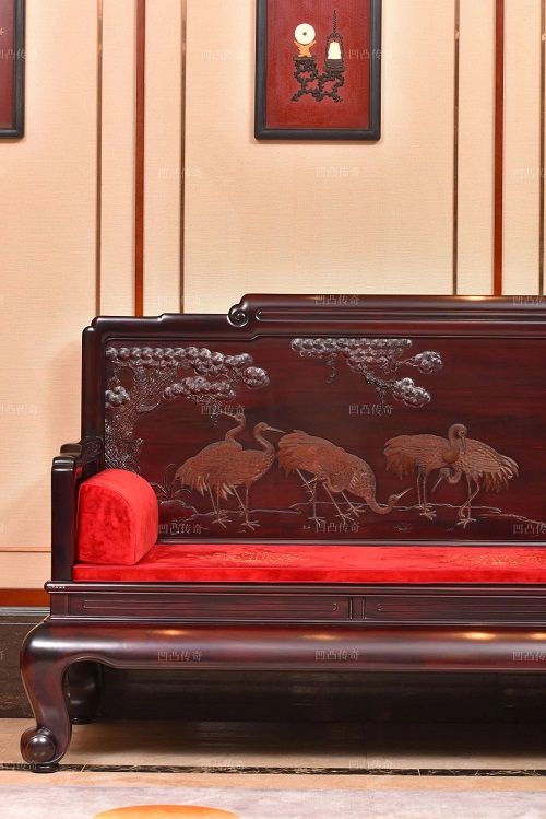 沙發(fā)周身,精心雕琢著松鶴延年圖,采用絲翎檀雕技法,將蒼松的遒勁與仙鶴的飄逸展現(xiàn)得淋漓盡致。