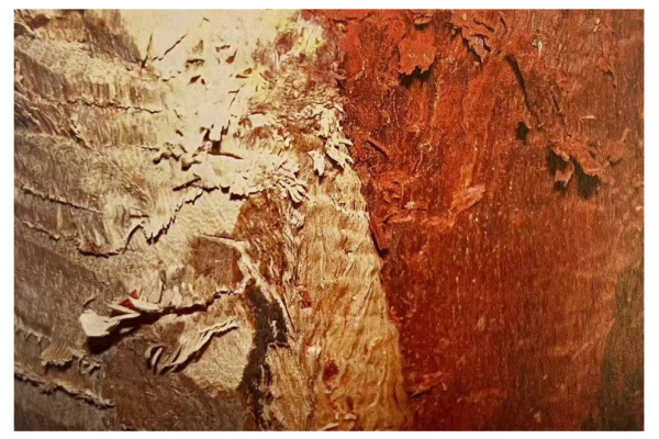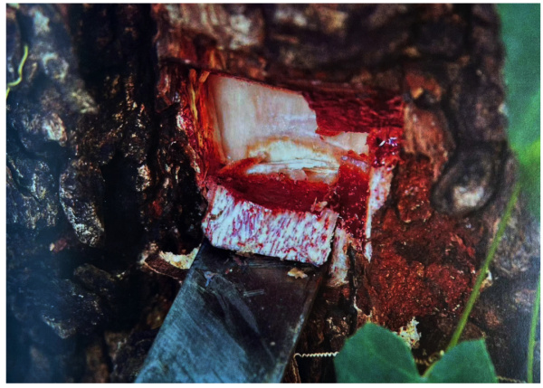 檀香紫檀活立木受到刀傷后外溢的鮮紅液體