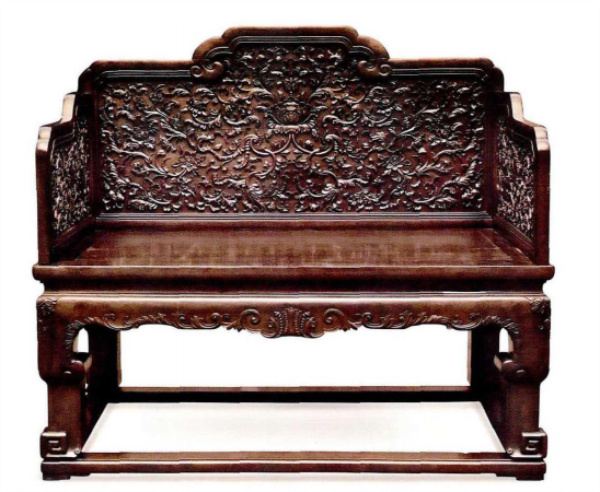 清式家具重視家具的氣勢和藝術(shù)效果,用材健碩,氣勢雄偉,精雕細(xì)刻,通常利用多種工藝、多種藝術(shù)手法進(jìn)行裝飾。凡木必雕,必鑲嵌……密不通風(fēng),富麗堂皇。清宮用了一百多年的時間把宮里家具幾乎都換成了紫檀,足以彰顯清宮對紫檀家具的偏愛,也從側(cè)面反映出紫檀家具在當(dāng)時的地位和價值。