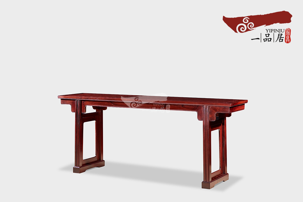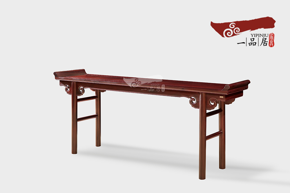 一品居明式翹頭案由緬甸紅酸枝制作而成,整體光素的案面,牙板兩端鎪出云紋牙頭,條案腿足直足式。造型古樸簡練,素雅端莊,盡顯明式家具的明快之感。