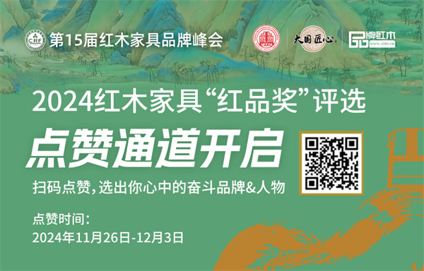 11月26 日,2024 CRF‘ 紅品獎(jiǎng)’紅木品牌盛典點(diǎn)贊重磅開(kāi)啟!紅木家具行業(yè)“2024年度之星”,由您一鍵選擇。點(diǎn)贊時(shí)間為2024年11月26日-12月3日。
