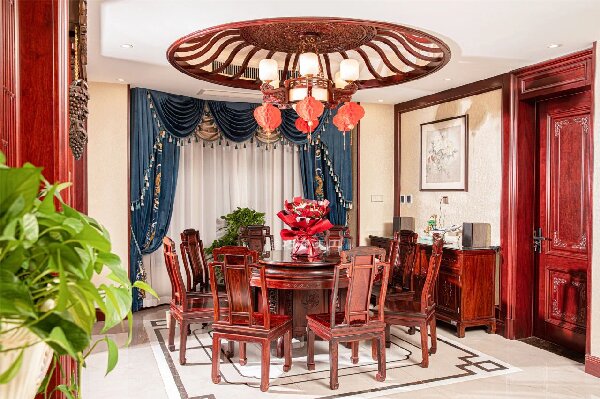 經(jīng)典的中式餐廳善用紅色與圓形的結(jié)合,此案選用色澤偏紅潤(rùn)的材質(zhì)分別做了門(mén)框、餐桌、餐邊柜、餐廳藻井等,增添空間的活力和氛圍。窗簾則選用藏藍(lán)色綢緞,自然而成的褶皺與垂感,增添了餐廳的典雅氣質(zhì)。