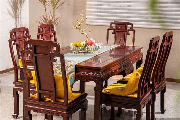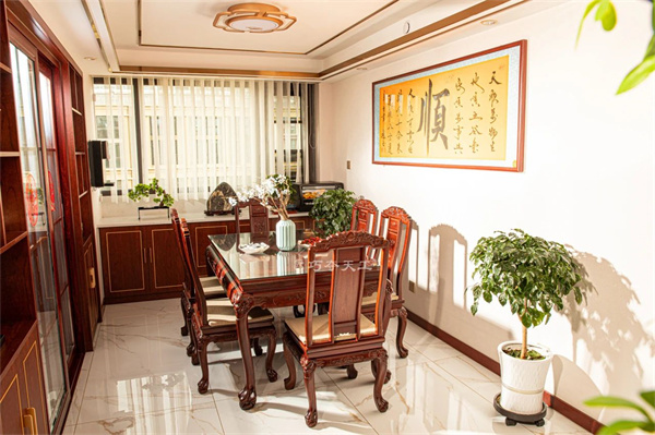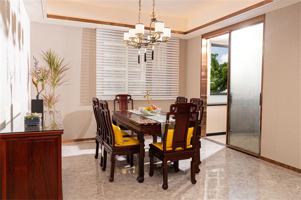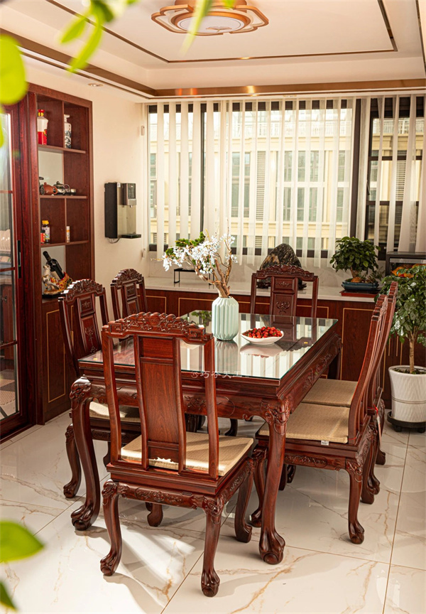 步入餐廳,一張古樸典雅的紅木長(zhǎng)方桌即刻映入眼簾,餐桌色澤深邃沉靜,桌旁的椅子設(shè)計(jì)獨(dú)特,搭腦部分采用了重疊的回紋設(shè)計(jì),不僅增加了視覺(jué)的層次感,更顯得精致而富有韻味。