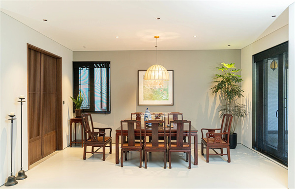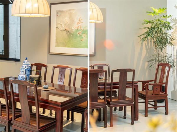 明式的餐椅背上栩栩如生的草木刻畫(huà)與餐廳一角的細(xì)條綠植相互呼應(yīng),營(yíng)造出一種和諧的自然氛圍。