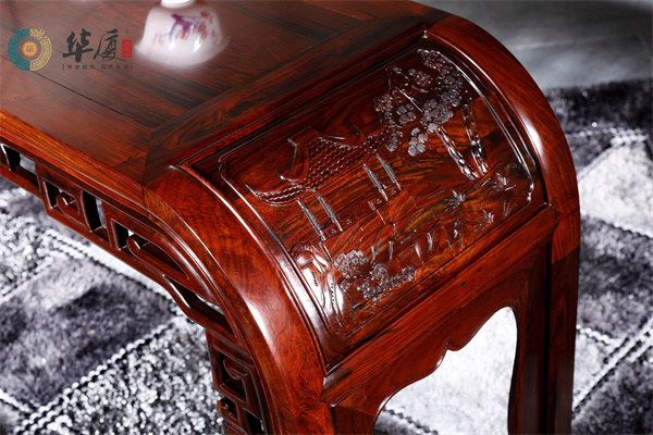 華廈大不同精心打造的琴案,選用珍貴的大紅酸枝木材,大紅酸枝的質(zhì)地堅硬穩(wěn)定,色澤沉穩(wěn)且紋理清晰,使琴案呈現(xiàn)出一種素雅而深邃的美感。