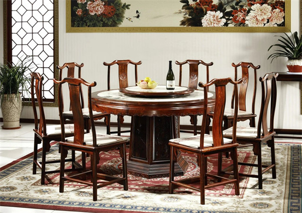 《大理石餐桌》以大紅酸枝為框架,桌面光潔平整,大小圓臺便捷就餐。臺面鑲嵌天然大理石,其紋理千變?nèi)f化,時而云霧山嶺,時而山川流水,精彩絕倫。