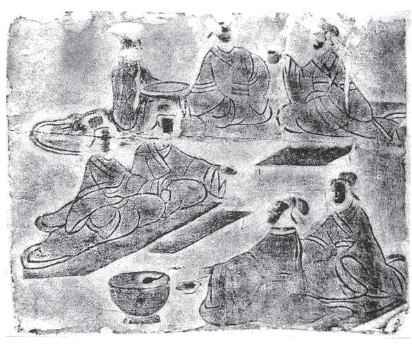 宴飲,四川新都出土漢畫(huà)像磚拓片。三人席地而坐