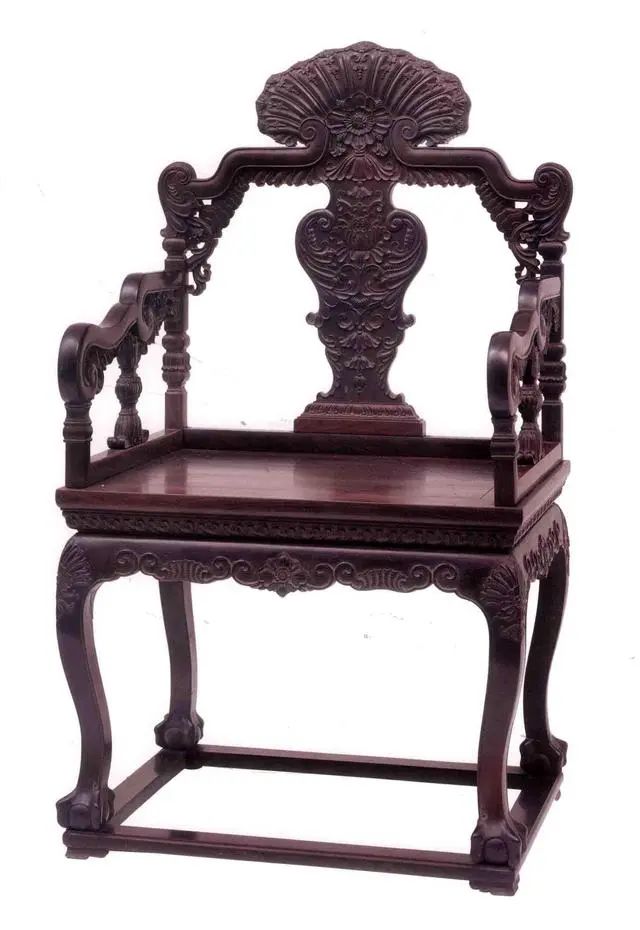 扇形搭腦:過(guò)肩突起且微向后仰形成扇形,其輪廓有小波浪,整體形態(tài)似孔雀開(kāi)屏?xí)r的羽翼,凸顯華貴富麗,此種搭腦形態(tài)甚是少見(jiàn)。