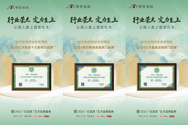 2024CRF“紅品獎(jiǎng)”紅木品牌盛典也同期舉行,明堂家居榮耀加冕,蟬聯(lián)“2024紅木家具十大影響力品牌”、“2024紅木整裝定制熱門(mén)品牌”、“2024微凹黃檀家具熱門(mén)品牌”三項(xiàng)大獎(jiǎng)。