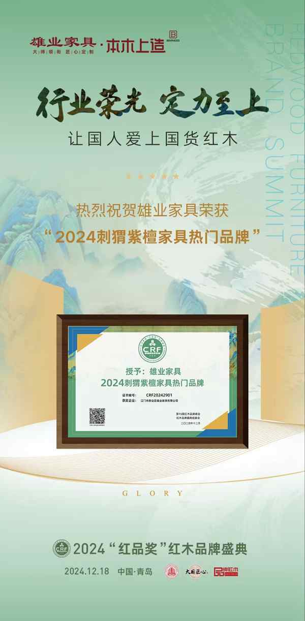 同期,備受矚目的CRF“紅品獎”紅木品牌盛典亦隆重拉開序幕。雄業(yè)家具憑借卓越品質口碑與強勁的綜合實力,斬獲“2024刺猬紫檀家具熱門品牌”殊榮,彰顯刺猬紫檀專業(yè)品牌風范。