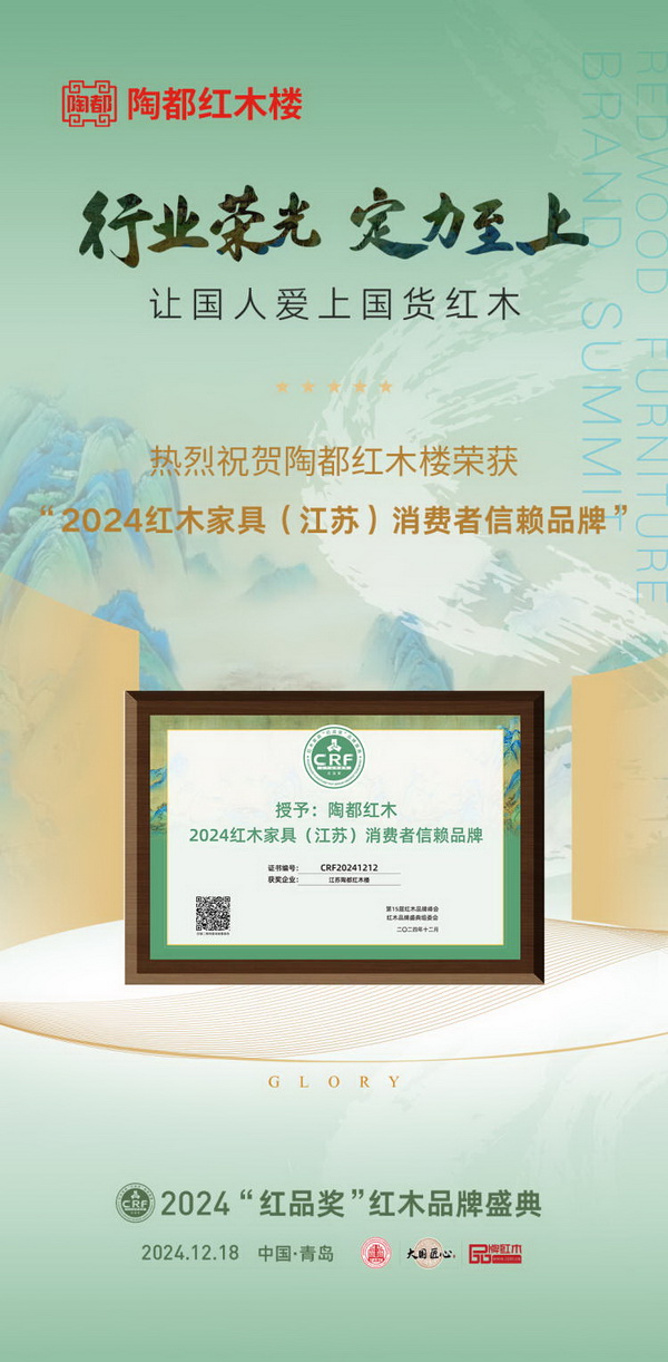 這是2024“紅品獎”紅木品牌盛典組委會授予江蘇省宜興市陶都紅木樓(以下簡稱“陶都紅木樓”)“2024特具影響力紅木家具區(qū)域品牌”的頒獎詞,以表彰陶都紅木樓在紅木區(qū)域市場上的卓越影響力和突出表現(xiàn)。