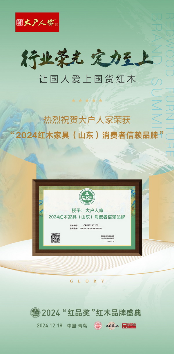 與此同時(shí),峰會(huì)同期舉辦了“2024‘紅品獎(jiǎng)’紅木品牌盛典”。大戶人家憑借其卓越的品牌實(shí)力和區(qū)域市場(chǎng)影響力,榮獲“2024特具影響力紅木家具區(qū)域品牌”。