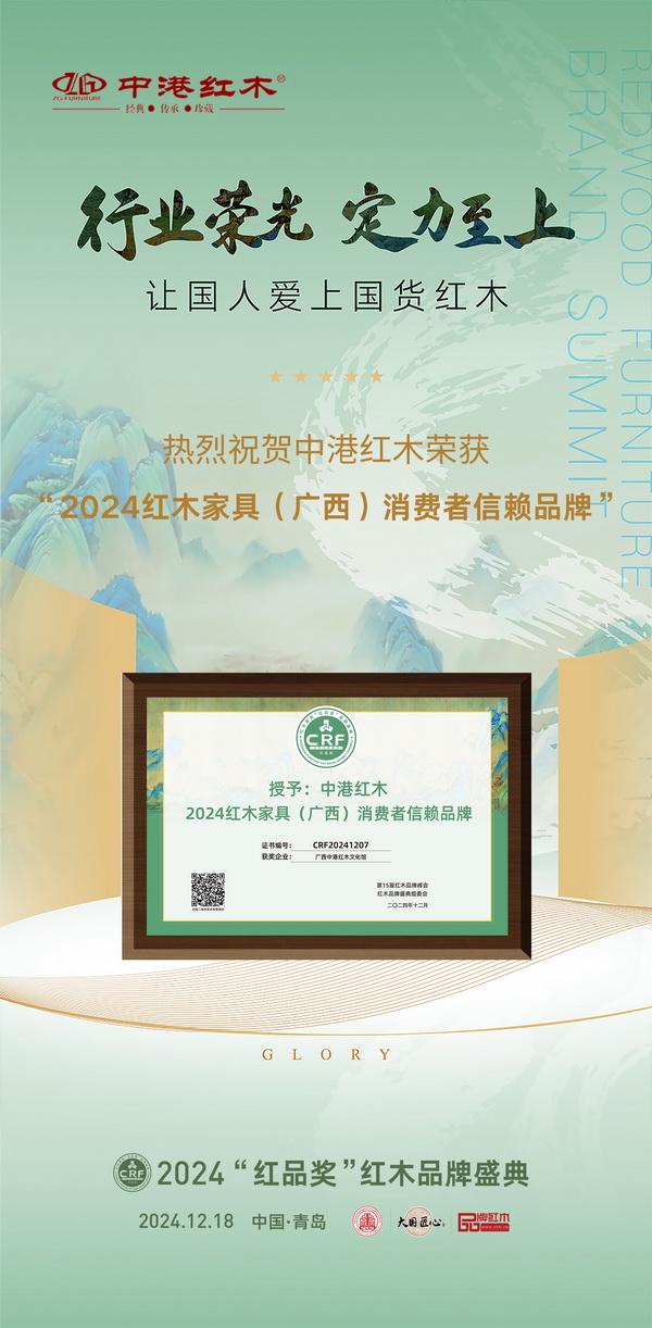“它深耕廣西紅木市場(chǎng)30余年,以誠(chéng)信卓越筑基,精誠(chéng)服務(wù)贏贊。它用紅木整裝為消費(fèi)者筑夢(mèng)高品位生活,弘揚(yáng)紅木文化,彰顯品牌活力,鑄就業(yè)界典范?!苯M委會(huì)授予中港紅木的頒獎(jiǎng)詞如是評(píng)價(jià)。