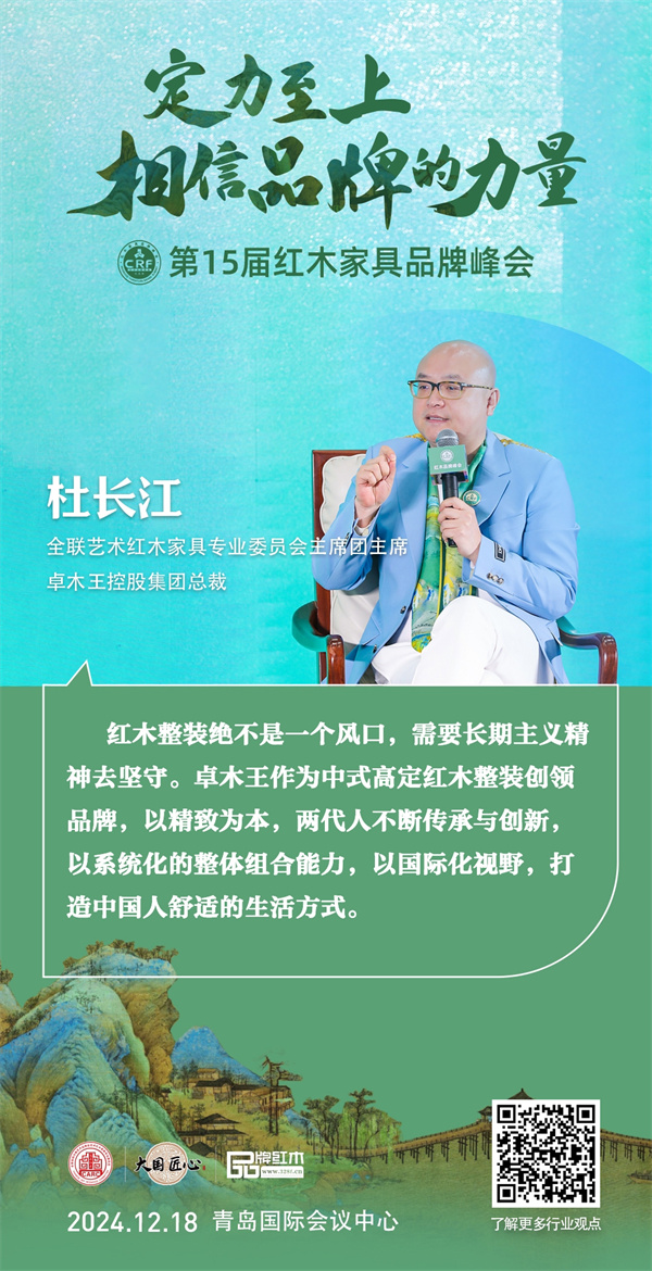在第15屆紅木品牌論壇對話環(huán)節(jié)中,全國工商聯(lián)藝術(shù)紅木家具專業(yè)委員會主席團(tuán)主席、卓木王總裁杜長江與其他優(yōu)秀紅木企業(yè)家代表一同討論了紅木整裝,緊跟新時代家居潮流的突圍思路。