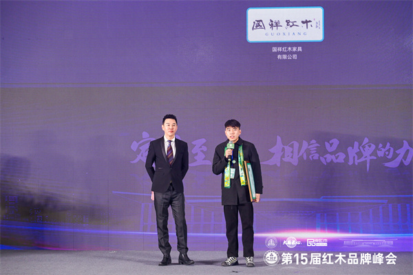 國祥紅木榮獲“2024紅木家具十大影響力品牌”,總經(jīng)理張宇杰上臺(tái)領(lǐng)獎(jiǎng)并接受央視主持人肖貴寧采訪。
