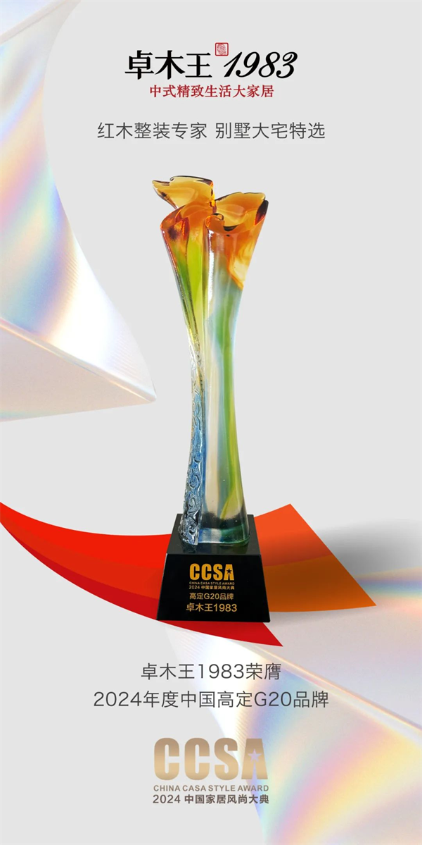 7月8日,卓木王受邀出席“第九屆CCSA中國家具風(fēng)尚大典暨2024高定G20+頒獎禮”,憑借其卓越的企業(yè)實力與品牌影響力,再度摘得“高定G20品牌大獎”。