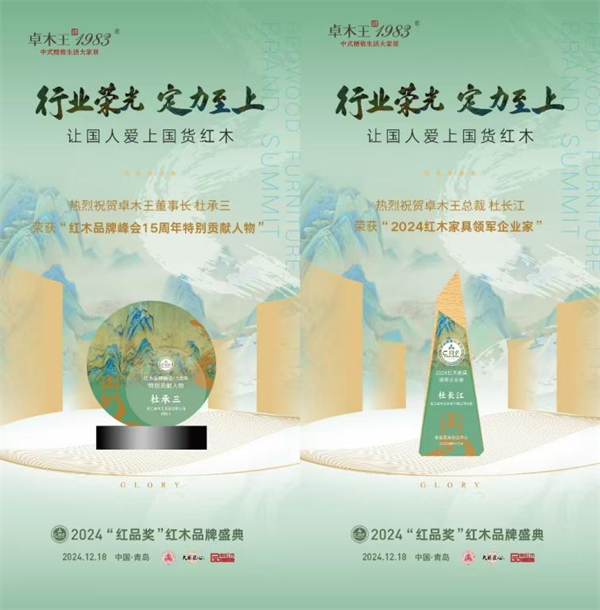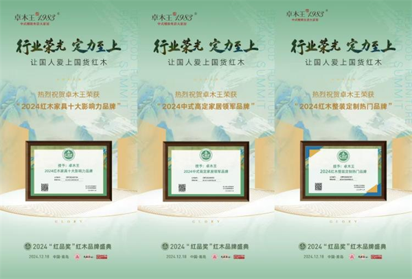 12月18日,第15屆紅木品牌峰會上,卓木王憑借其在業(yè)界的卓越影響力與杰出貢獻(xiàn),成為全場矚目的焦點,一舉斬獲五項大獎,包括“紅木品牌峰會15周年特別貢獻(xiàn)人物獎”“2024紅木家具領(lǐng)軍企業(yè)家”、“紅木家具十大影響力品牌”、“紅木整裝定制領(lǐng)軍品牌”以及蟬聯(lián)“中式高定家居領(lǐng)軍品牌”。